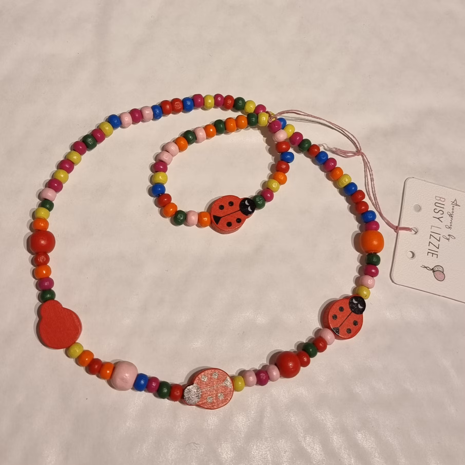 Gulligt halsband och armband med berlocker i trä. Trätt på gummiband. Halsband 40 cm i diameter plus töj.