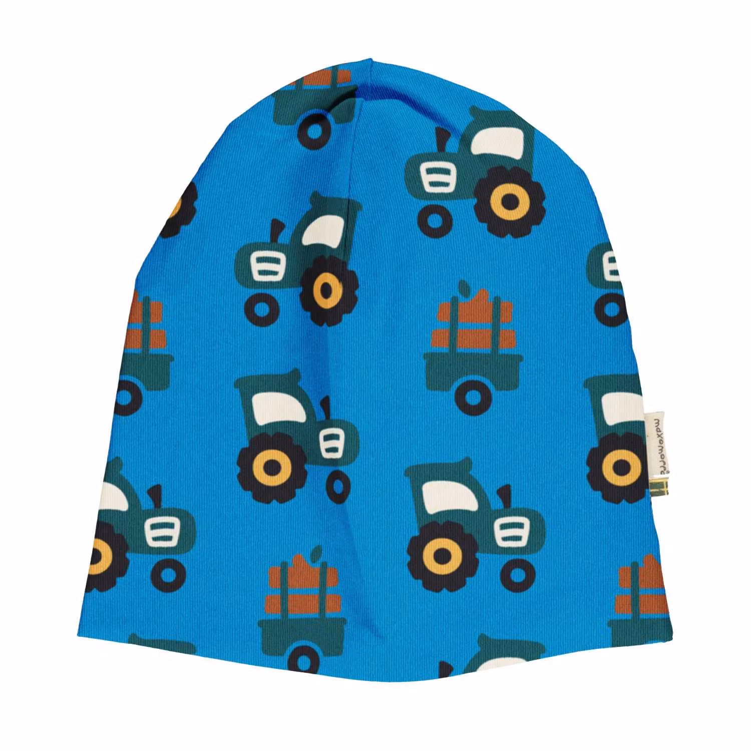 Mössa i blått med traktormotiv. 95% ekobomull, 5% elastan. Tvätt 40 grader.