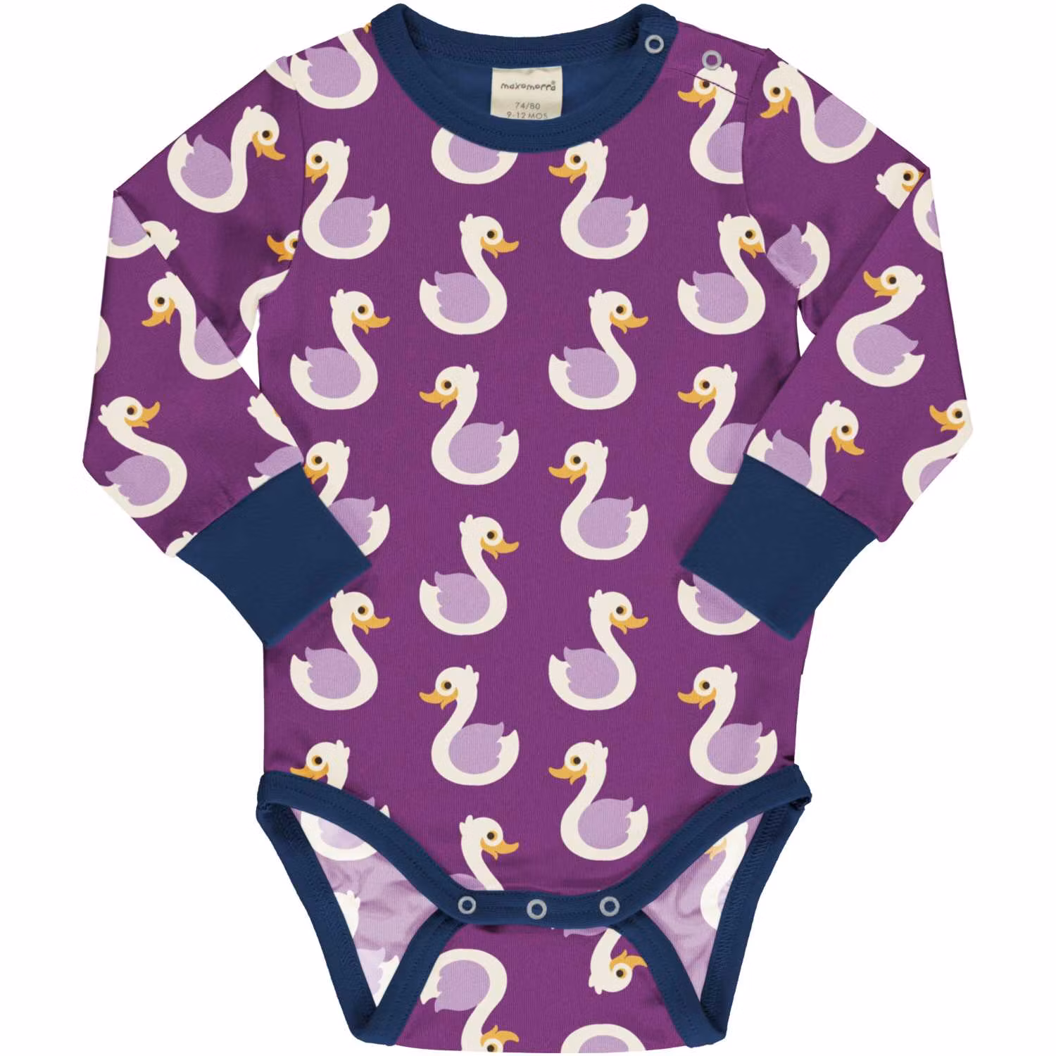 - Body storlek 50/56 Långärmad body, lila med svarta kantband och muddar. 95% ekobomull, 5% elastan. Tvätt 40 grader.