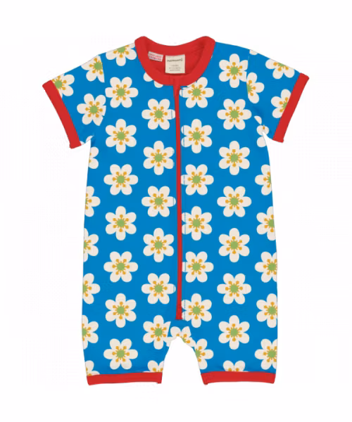 - Summersuit One-piece i blått med röda kantband. Dragkedja. 95% ekobomull, 5% elastan. Tvätt 40 grader.