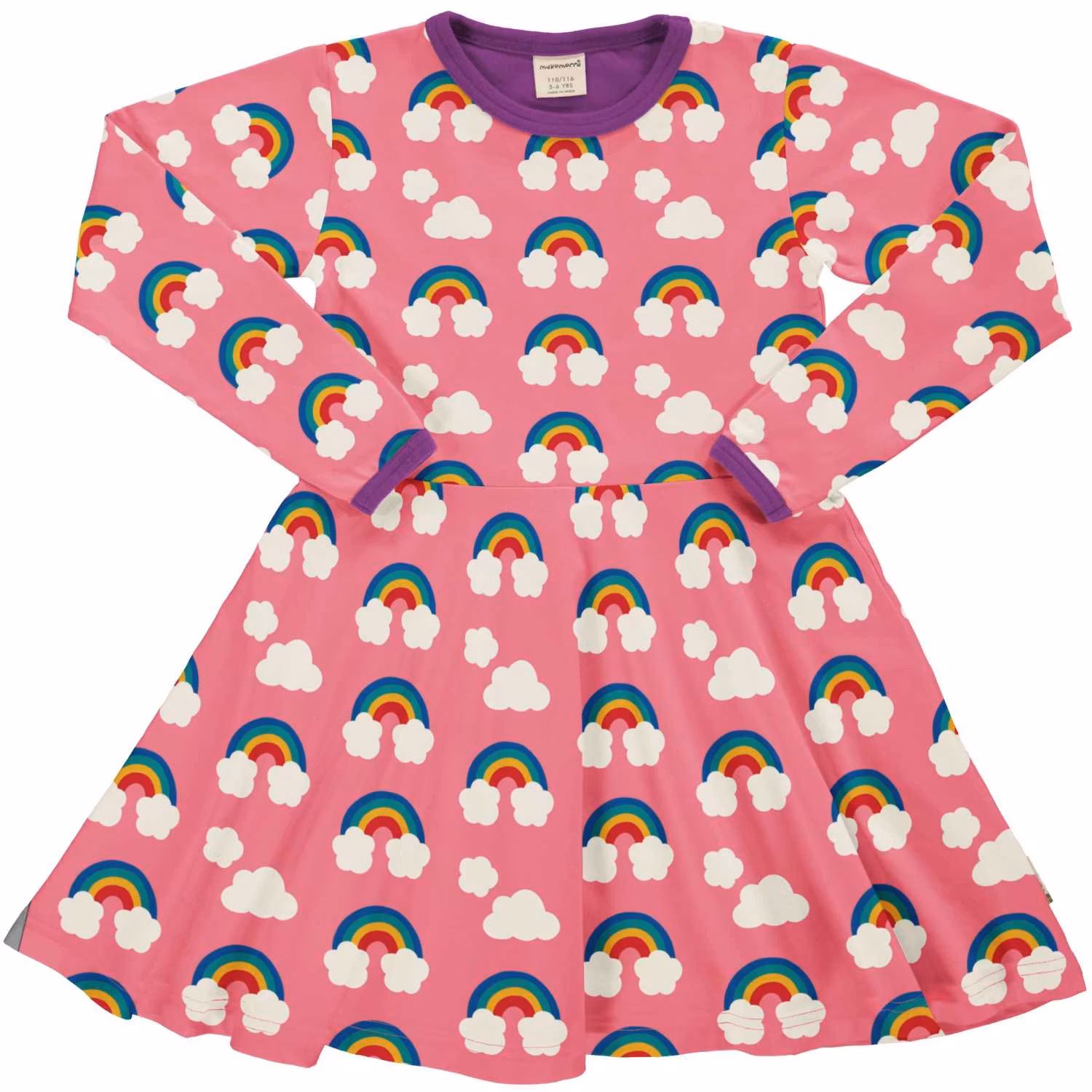 Långärmad klänning med volangkjol, rosa med lila kantband. 95% ekobomull, 5% elastan. Tvätt 40 grader.