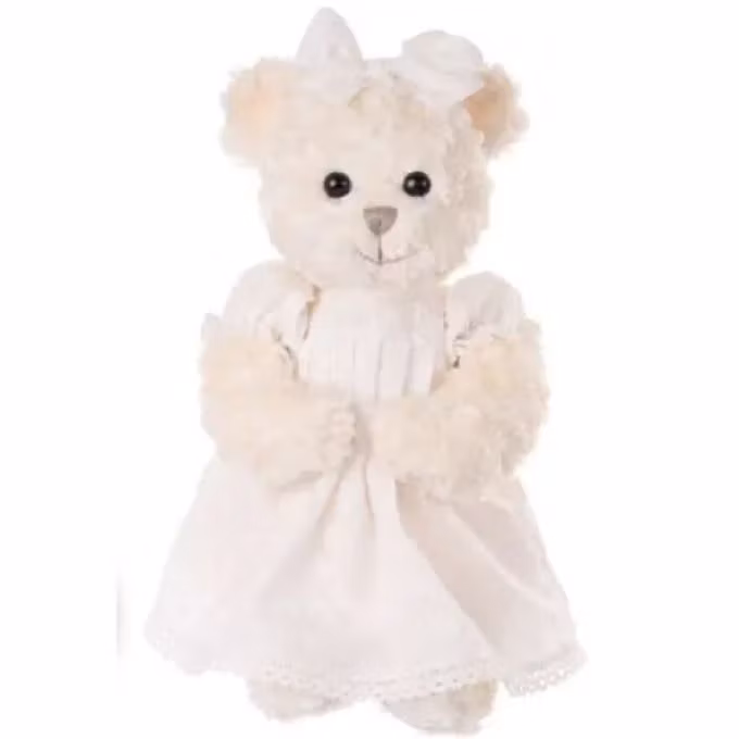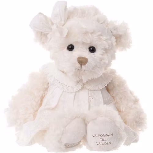 Lilla gumman är 35 cm, härligt mjuk och klädd i söt klänning och rosett på huvudet. sydd nos, nitade ögon och vit päls. Välkommen till världen är broderat under ena tassen.