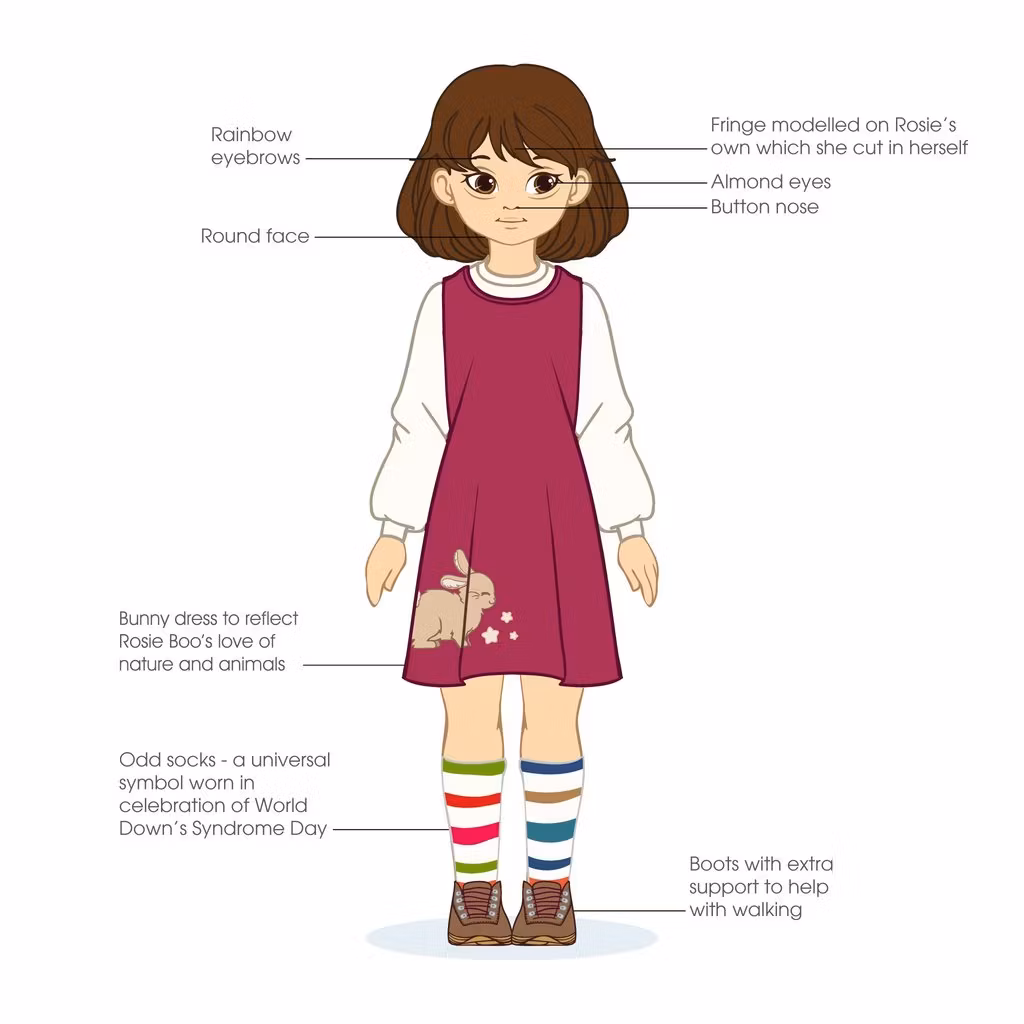 Dockan är 18 cm hög, kan stå av sig själv och utformades utifrån proportionerna på 9-åriga tjejer. Armar och ben kan vridas och riktas som man vill, och knäna går att böja försiktigt till tre olika positioner. Dockan är tillverkad av ftalatfri vinylplast. Dockan kommer med en manchester-klänning dekorerad med en söt kanin som representerar Rosie Boos kärlek till djur och natur, udda strumpor och kängor med extra stöd för att hjälpa henne gå.