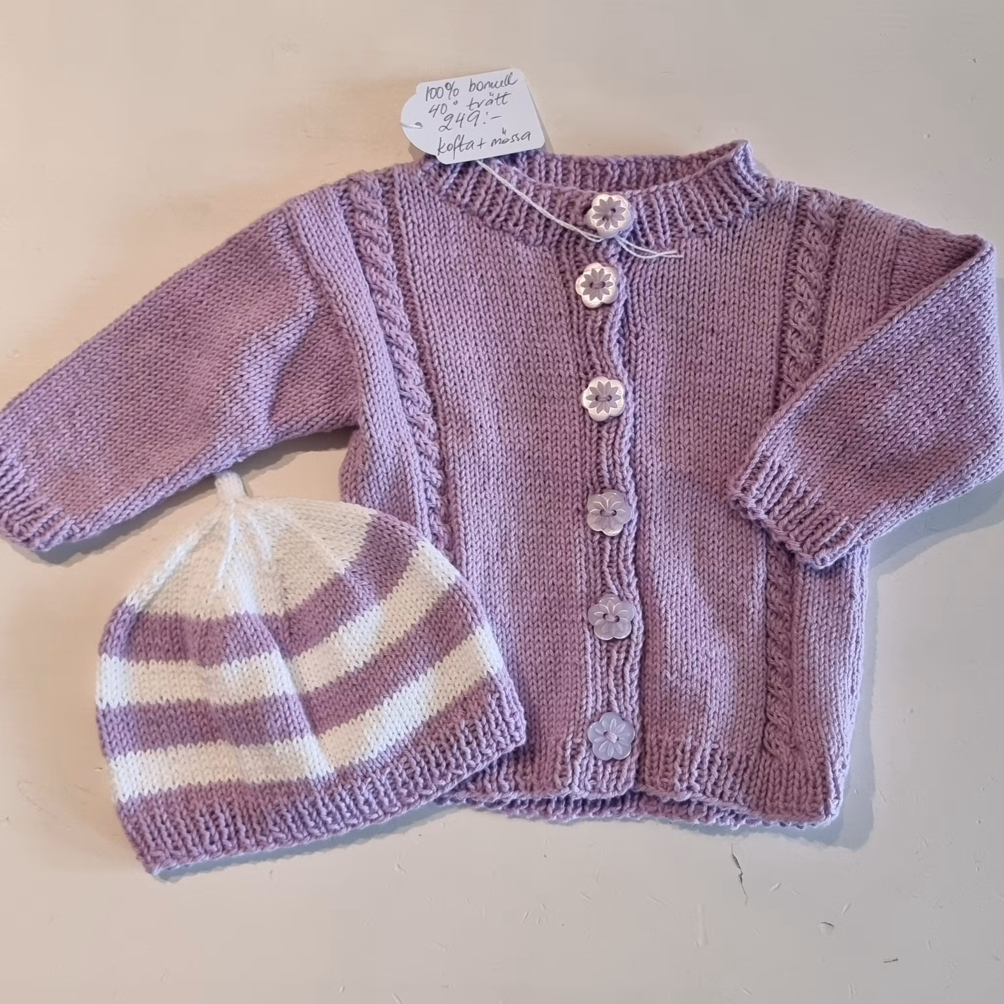 Duktiga Kicki stickar till små barn. Syrenlila kofta med blomknappar och randig mössa. Till ca 3 mån. 100% bomull. Tvätt 40 grader, ej s