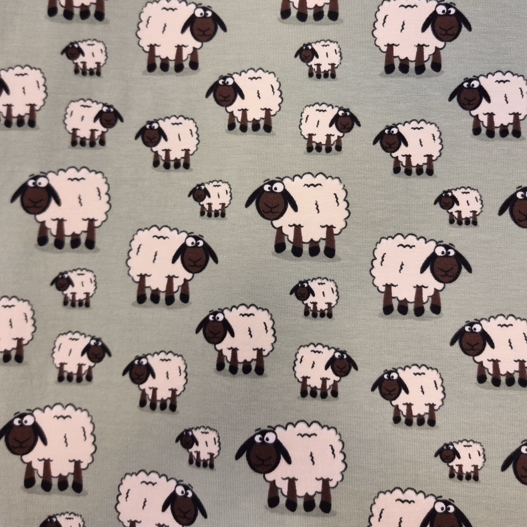 Roligt tyg i fint grön med får på, perfekt till alla sorts plagg - t-shirts, klänningar mm. Exempel på uppsydda plagg. 95% bomull, 5% elastan. Ökotex. Bredd 150 cm.